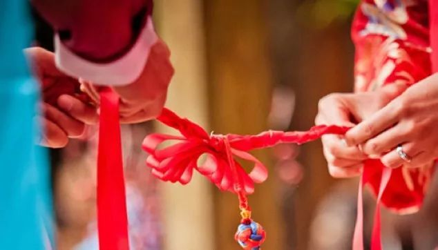 后來,人們就稱首次結(jié)婚的男女為“結(jié)發(fā)夫妻”。在有些新婚洞房中可看到火紅色的“同心結(jié)”,即是古代同心發(fā)結(jié)的延伸,“結(jié)”字取其堅(jiān)固、結(jié)伴、結(jié)合之意。