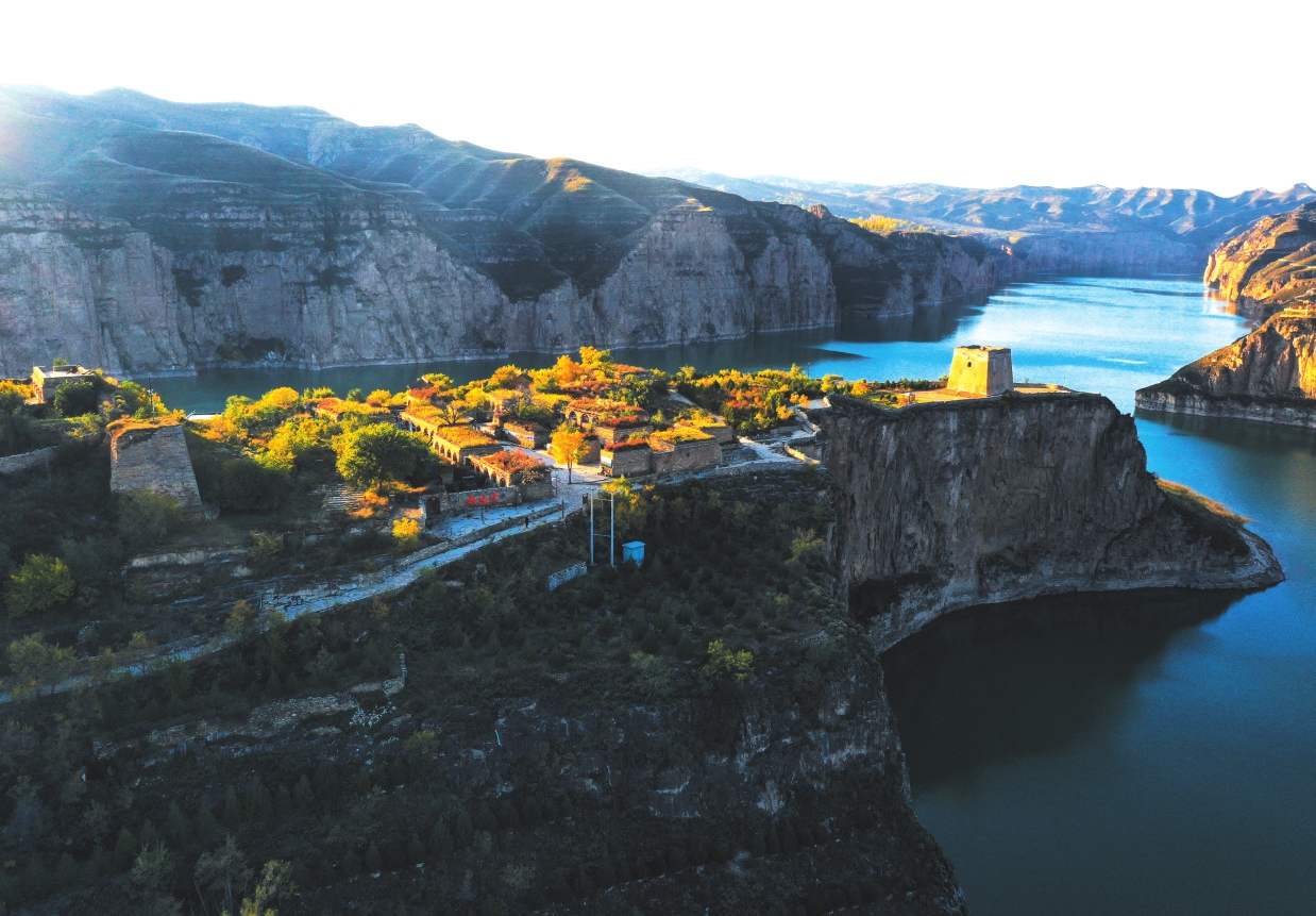 2015年的夏天,我又一次來(lái)到老牛灣,105米高的萬(wàn)家寨水電大壩飛跨晉蒙,黃河水在絕壁中安靜了、變綠了。老牛灣村前的小河倒灌進(jìn)了黃河水,一個(gè)灣成了兩個(gè)灣,團(tuán)團(tuán)地圍住了山村,又好似老牛彎出了兩個(gè)碧綠的牛角,太漂亮了。老鄉(xiāng)們說(shuō):“有企業(yè)來(lái)開(kāi)發(fā)道路、景區(qū)了,也有北京游客開(kāi)車來(lái)游玩了,拍照的多,照幾張相就走了?!蓖侨匀粴埰频拈T樓和石板院房,我不知該說(shuō)什么、能說(shuō)什么。