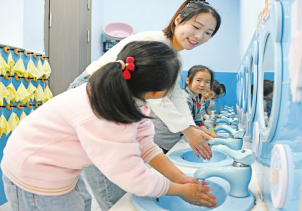 4月7日,浙江省臺州市仙居縣中心幼兒園小朋友在學(xué)習(xí)正確的洗手方法。世界衛(wèi)生日當(dāng)日,各地舉行形式多樣的主題活動,倡導(dǎo)良好的衛(wèi)生習(xí)慣和健康的生活方式。