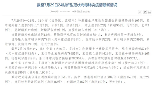 人民網(wǎng)北京7月30日電(董童)國(guó)家衛(wèi)生健康委于今日在官網(wǎng)發(fā)布的《截至7月29日24時(shí)新型冠狀病毒肺炎疫情最新情況》(以下簡(jiǎn)稱“情況”)提出,7月29日0—24時(shí),31個(gè)?。ㄗ灾螀^(qū)、直轄市)和新疆生產(chǎn)建設(shè)兵團(tuán)報(bào)告新增確診病例105例,其中境外輸入病例3例(廣東1例,云南1例,陜西1例),本土病例102例(新疆96例,遼寧5例,北京1例);無新增死亡病例;新增疑似病例1例,為境外輸入病例(在上海)。當(dāng)日新增治愈出院病例13例,解除醫(yī)學(xué)觀察的密切接觸者584人,重癥病例較前一日增加8例。