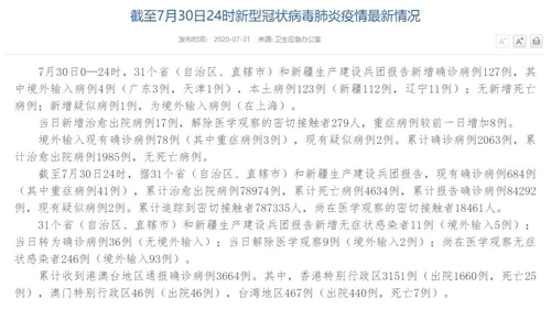 人民網北京7月31日電(董童)國家衛(wèi)生健康委于今日在官網發(fā)布的《截至7月30日24時新型冠狀病毒肺炎疫情最新情況》(以下簡稱“情況”)提出,7月30日0—24時,31個省(自治區(qū)、直轄市)和新疆生產建設兵團報告新增確診病例127例,其中境外輸入病例4例(廣東3例,天津1例),本土病例123例(新疆112例,遼寧11例);無新增死亡病例;新增疑似病例1例,為境外輸入病例(在上海)。當日新增治愈出院病例17例,解除醫(yī)學觀察的密切接觸者279人,重癥病例較前一日增加8例。