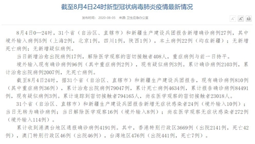 情況顯示,截至8月4日24時(shí),據(jù)31個(gè)?。ㄗ灾螀^(qū)、直轄市)和新疆生產(chǎn)建設(shè)兵團(tuán)報(bào)告,現(xiàn)有確診病例810例(其中重癥病例36例),累計(jì)治愈出院病例79047例,累計(jì)死亡病例4634例,累計(jì)報(bào)告確診病例84491例,現(xiàn)有疑似病例3例。累計(jì)追蹤到密切接觸者794165人,尚在醫(yī)學(xué)觀察的密切接觸者23018人。