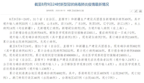 情況顯示,截至8月9日24時(shí),據(jù)31個(gè)?。ㄗ灾螀^(qū)、直轄市)和新疆生產(chǎn)建設(shè)兵團(tuán)報(bào)告,現(xiàn)有確診病例802例(其中重癥病例41例),累計(jì)治愈出院病例79232例,累計(jì)死亡病例4634例,累計(jì)報(bào)告確診病例84668例,現(xiàn)有疑似病例7例。累計(jì)追蹤到密切接觸者800809人,尚在醫(yī)學(xué)觀(guān)察的密切接觸者24055人。