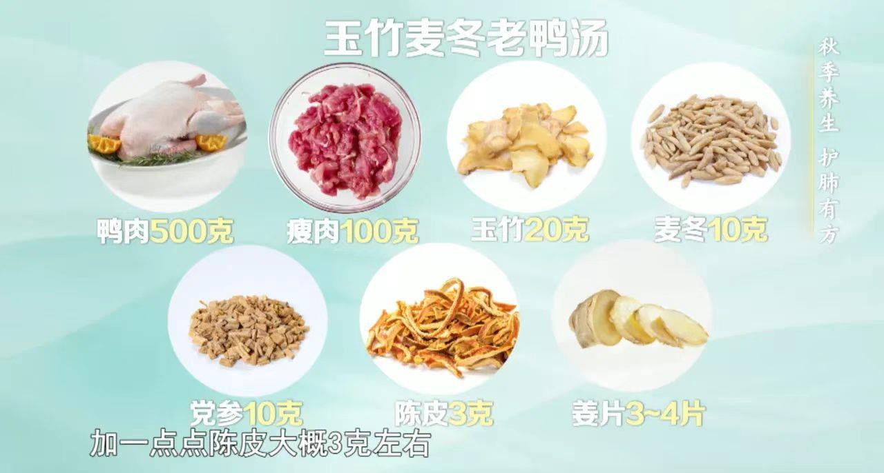 材料:鴨肉500克、瘦肉100克、玉竹20克、麥冬10克、黨參10克、陳皮3克、姜3~4片、鹽少許。