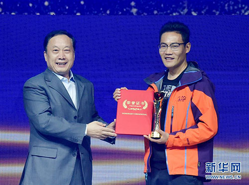1月18日,“環(huán)保衛(wèi)士”次仁旦達(dá)(右)上臺(tái)領(lǐng)獎(jiǎng)。 當(dāng)日,新華社主辦的“中國網(wǎng)事·感動(dòng)2018”年度頒獎(jiǎng)典禮在中國傳媒大學(xué)舉行,10位“草根”成為舞臺(tái)上最閃亮的明星。新華社記者 李賀 攝 “環(huán)保衛(wèi)士”次仁旦達(dá):頂著每秒20米的風(fēng)速,冒著零下50攝氏度的嚴(yán)寒,拾起沿途遺棄在珠峰上的各種廢棄物品。從一人干到帶動(dòng)多人干,在人類徒步能夠到達(dá)的極限,踐行環(huán)保。