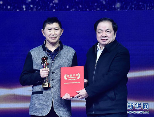 1月18日,“粉筆畫老師”張舉文(左)上臺(tái)領(lǐng)獎(jiǎng)。當(dāng)日,新華社主辦的“中國網(wǎng)事·感動(dòng)2018”年度頒獎(jiǎng)典禮在中國傳媒大學(xué)舉行,10位“草根”成為舞臺(tái)上最閃亮的明星。新華社記者 李賀 攝 “粉筆畫老師”張舉文:18歲高中畢業(yè)就開始在山區(qū)教語文,他為小學(xué)、初中的孩子們用粉筆畫插畫,一畫就是42年。 |