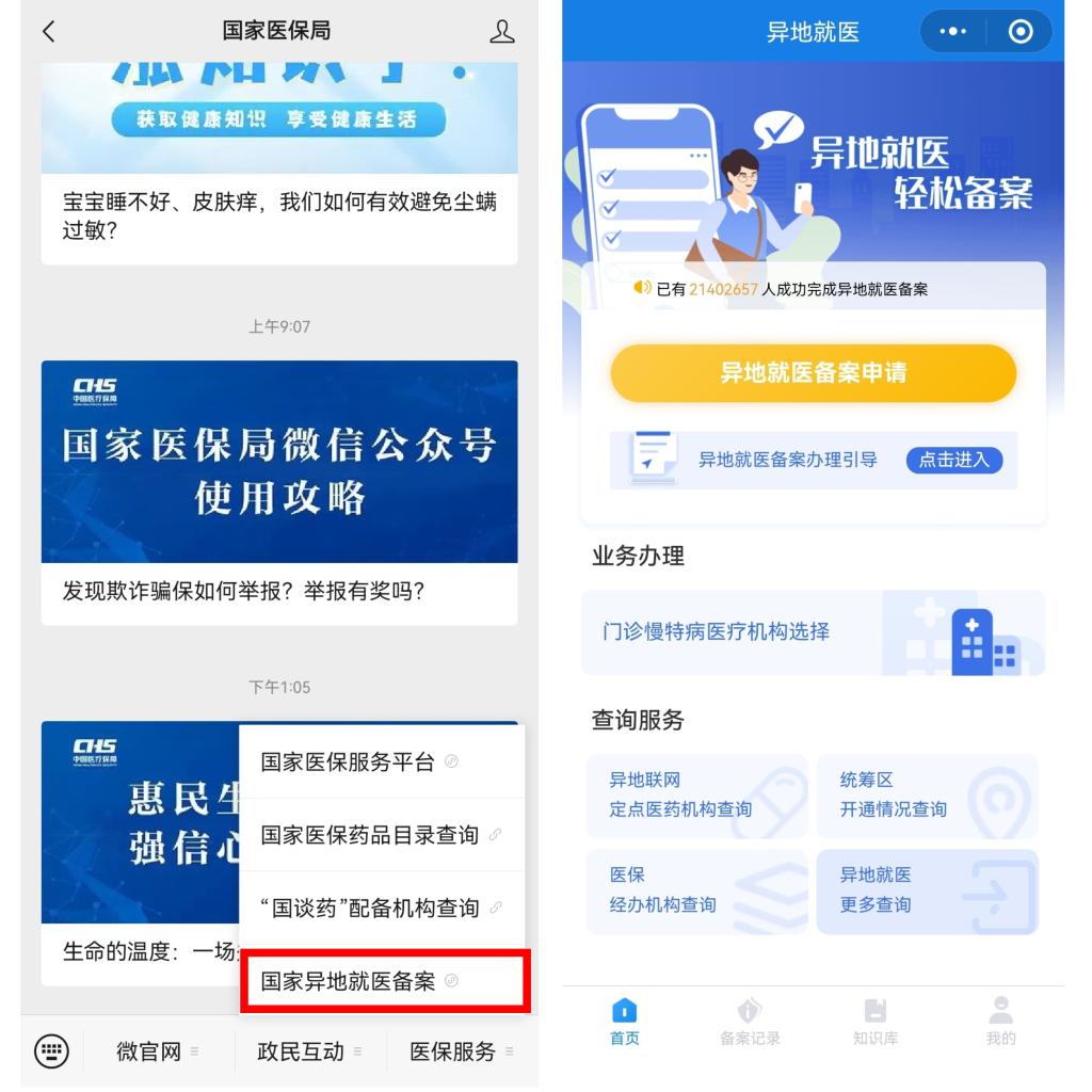 跨省異地長期居住或跨省臨時外出就醫(yī)的參保人員,辦理異地就醫(yī)備案后,可以享受跨省異地就醫(yī)直接結(jié)算服務(wù)。記者從國家醫(yī)保局了解到,國家醫(yī)保局微信公眾號已開通異地就醫(yī)備案辦理功能。符合條件的參保人員只需簡單幾步操作,即可完成跨省異地就醫(yī)備案,并在異地就醫(yī)時實現(xiàn)直接結(jié)算。