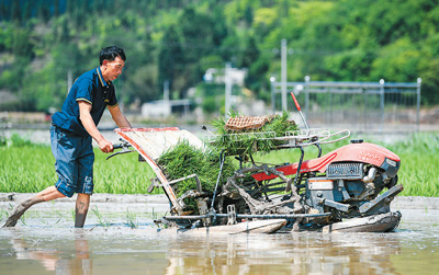 立夏過后,多地農(nóng)民搶抓農(nóng)時(shí),陸續(xù)開展水稻插秧工作。圖為農(nóng)機(jī)手操作插秧機(jī)在貴州省黔西南布依族苗族自治州安龍縣春潭街道阿興村進(jìn)行插秧作業(yè)。據(jù)了解,當(dāng)?shù)亟陙硗ㄟ^建設(shè)高標(biāo)準(zhǔn)農(nóng)田,積極推廣多種農(nóng)用機(jī)械,不斷夯實(shí)糧食生產(chǎn)基礎(chǔ)。劉朝富攝(人民視覺)