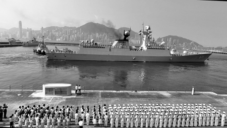 儀式結(jié)束后,湛江艦、運(yùn)城艦響起清脆的海軍笛,官兵們?cè)谙线叿謪^(qū)列隊(duì),向碼頭上的人群揮手致意,兩艘艦艇駛離昂船洲軍營(yíng)碼頭,前往預(yù)定海域與山東艦、延安艦會(huì)合。香港特區(qū)直升機(jī)、船隊(duì)一路引航伴航,護(hù)送編隊(duì)駛出區(qū)界。