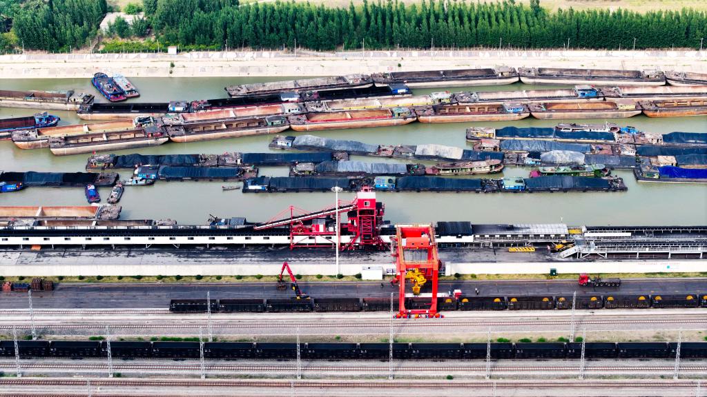 6月8日,在濟(jì)寧港航梁山港,船舶停靠等待裝運(yùn)煤炭(無人機(jī)照片)。新華社記者郭緒雷 攝
