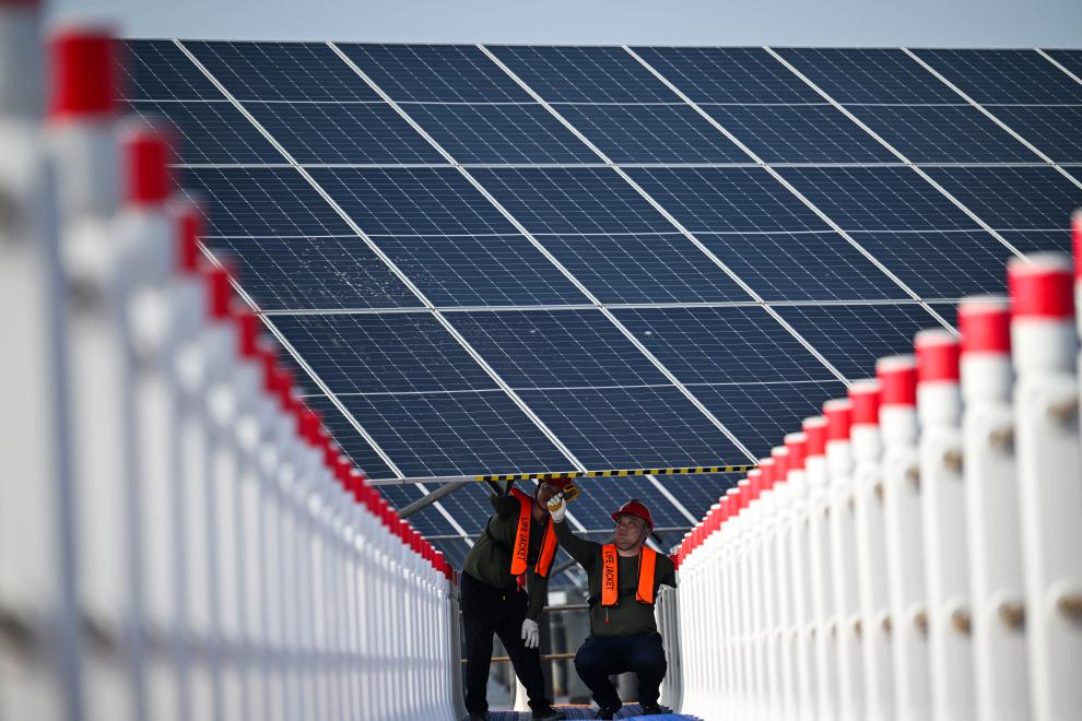 7月10日,在國家能源集團(tuán)天津龍?jiān)葱履茉从邢薰静郴夥娬?,工作人員在檢查光伏發(fā)電板。新華社記者趙子碩 攝