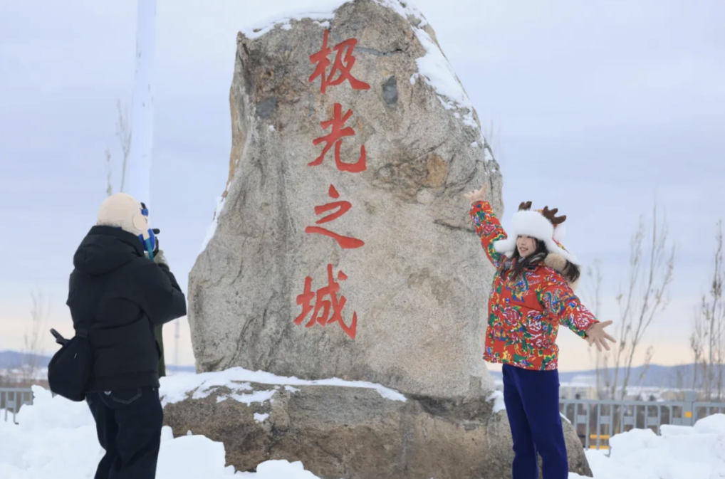 游客在漠河站站前廣場與“極光之城”碑打卡。新華社發(fā)(徐率攝)