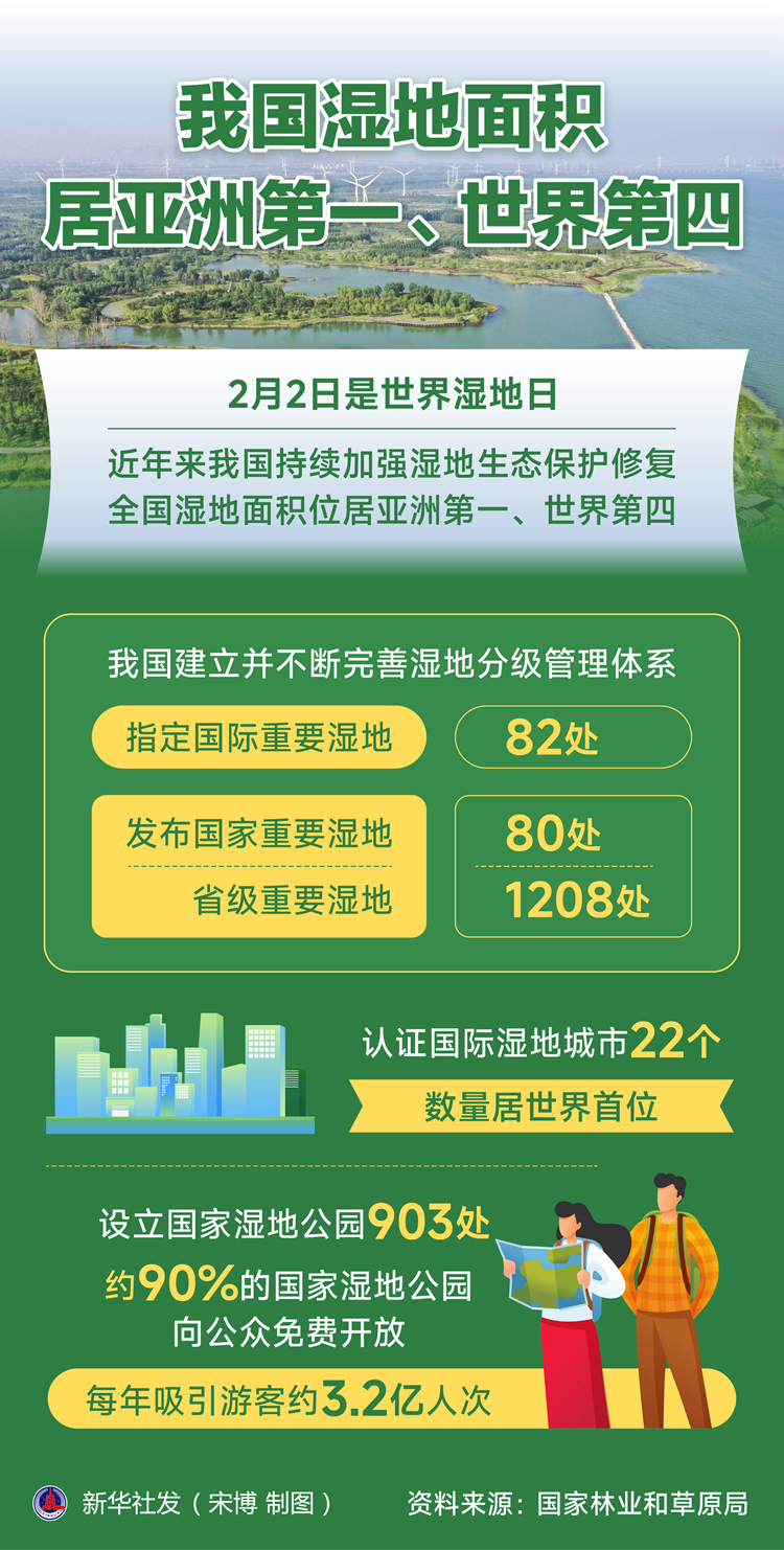 新華社北京2月2日電(記者黃垚)2月2日是世界濕地日。記者當天從國家林業(yè)和草原局獲悉,近年來我國持續(xù)加強濕地生態(tài)保護修復(fù),全國濕地面積位居亞洲第一、世界第四,濕地保護形成重點治理和分類保護相結(jié)合的新格局。 濕地是地球三大生態(tài)系統(tǒng)之一,具有不可替代的生態(tài)、社會、經(jīng)濟和文化價值。近年來我國不斷強化濕地保護法治保障,完善依法治理體系,頒布實施濕地保護法,相關(guān)部門出臺促進濕地恢復(fù)配套制度,全國21個省(區(qū)、市)完成省級濕地保護條例制修訂。 據(jù)介紹,我國建立并不斷完善濕地分級管理體系,指定國際重要濕地82處,發(fā)布國家重要濕地80處、省級重要濕地1208處。認證國際濕地城市22個,數(shù)量居世界首位;設(shè)立國家濕地公園903處,約90%的國家濕地公園向公眾免費開放,每年吸引游客約3.2億人次。 同時,我國持續(xù)開展?jié)竦乇Wo修復(fù),累計實施3800多個項目,新增和修復(fù)濕地面積100余萬公頃;實施紅樹林保護修復(fù)和互花米草防治專項行動,累計營造紅樹林9200公頃,除治互花米草9.73萬公頃。持續(xù)深化國際履約,提出濕地保護中國方案,正式成立并高質(zhì)量建設(shè)國際紅樹林中心,意向成員國增至20個。 “十五五”期間,我國將進一步加強濕地資源的科學保護、系統(tǒng)治理和合理利用,包括著力健全法律法規(guī)體系,加強濕地生態(tài)系統(tǒng)等本底調(diào)查、動態(tài)監(jiān)測與預(yù)警,統(tǒng)籌實施濕地保護修復(fù)工程項目,加快建立健全濕地生態(tài)產(chǎn)品價值實現(xiàn)機制等。