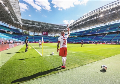 5月16日,德甲萊比錫隊球員安杰利諾準(zhǔn)備主罰角球。新華社發(fā)