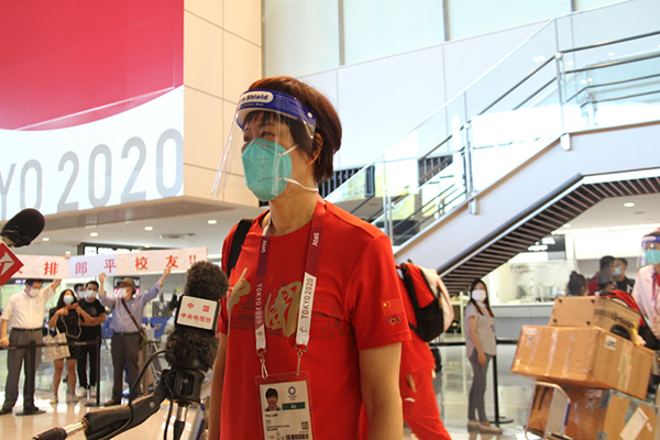 7月19日晚,中國(guó)女排主教練郎平在抵達(dá)東京成田機(jī)場(chǎng)后接受媒體采訪。李沐航攝