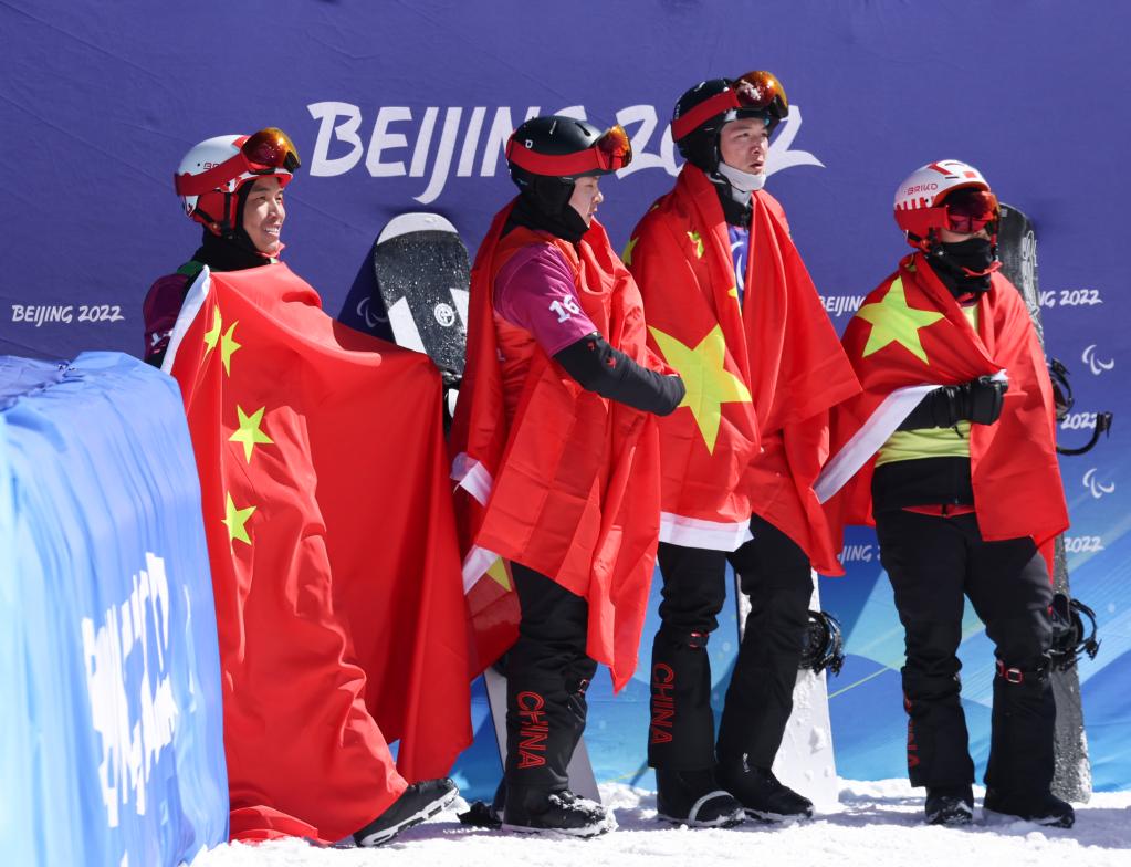 四面五星紅旗分別披在四位選手身上,他們享受著來自場內四面八方的歡呼。他們的名字是紀立家、王鵬耀、朱永鋼、張義琦,他們是北京冬殘奧會殘奧單板滑雪男子障礙追逐UL級比賽大決賽的全部四名參賽選手,冠亞季殿軍獲得者。