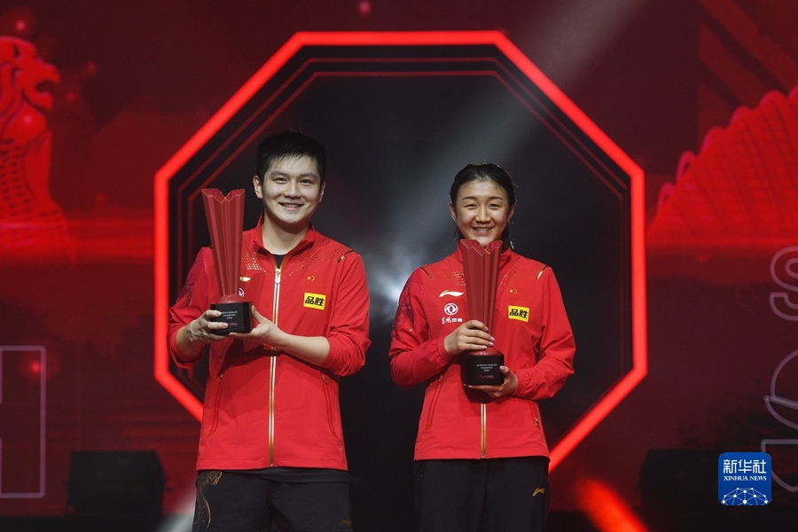 3月20日,中國選手樊振東(左)與本次比賽女單冠軍、隊友陳夢在頒獎儀式上。新華社發(fā)(鄧智煒攝)