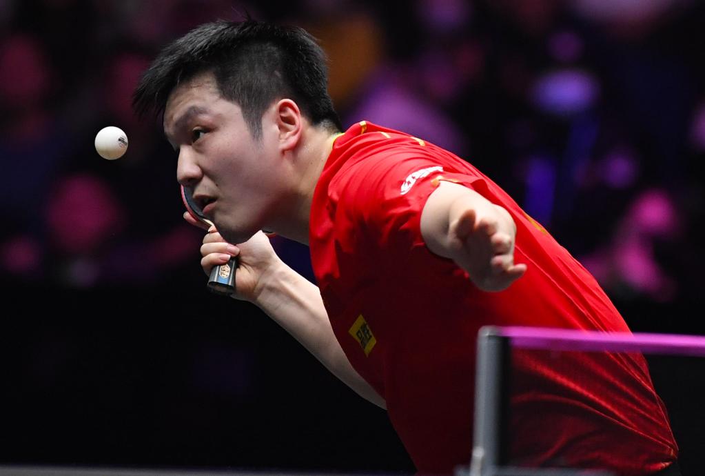 4月12日,樊振東在比賽中發(fā)球。新華社記者 郝源 攝