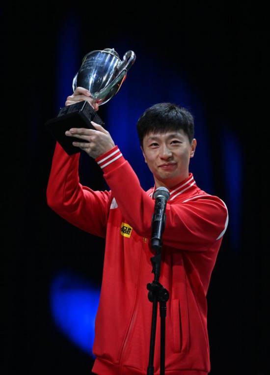 當(dāng)日兩場(chǎng)單打決賽之間,國際乒聯(lián)為2015年至2019年完成世乒賽男單三連冠的馬龍頒發(fā)了復(fù)刻圣·勃萊德杯。(蘇斌、謝江)