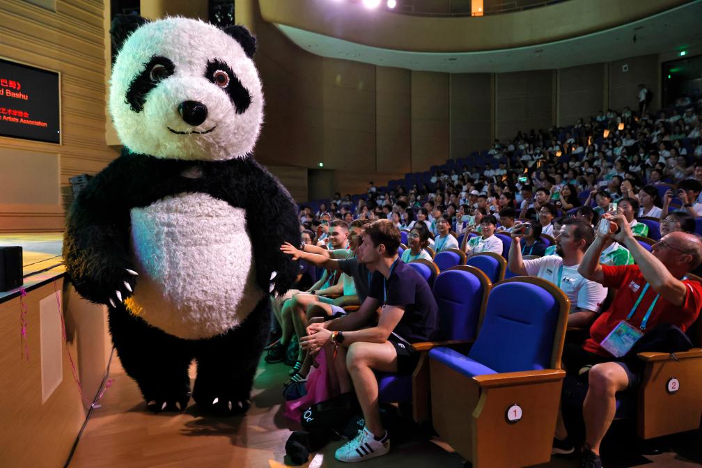 8月2日,一名演員裝扮成大熊貓?jiān)谘莩鲩g隙與觀(guān)眾互動(dòng)。當(dāng)日,“奇幻之夜”雜技魔術(shù)晚會(huì)在成都大運(yùn)村藝術(shù)中心大劇場(chǎng)舉行。本場(chǎng)活動(dòng)是在大運(yùn)村舉辦的“Be Together”主題系列晚會(huì)之一。新華社記者沈伯韓攝