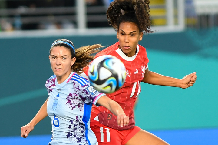 8月5日,女足世界杯八分之一決賽,西班牙隊以5:1戰(zhàn)勝瑞士隊,圖為西班牙隊球員艾塔納·邦馬蒂(左)與瑞士隊球員孔巴·索烏在比賽中拼搶。新華社記者郭磊攝