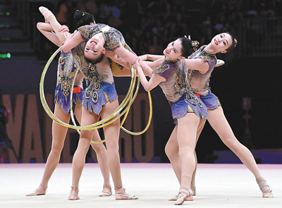 中國藝術(shù)體操隊的良好狀態(tài)延續(xù)到最后一個比賽日。在5圈單項決賽中,率先登場的中國隊高質(zhì)量地完成整套動作,以36.550分獲得金牌,為中國藝術(shù)體操隊贏得首個世界冠軍。在隨后進行的3帶2球單項決賽中,中國隊依舊發(fā)揮亮眼,以32.800分收獲一枚銀牌。