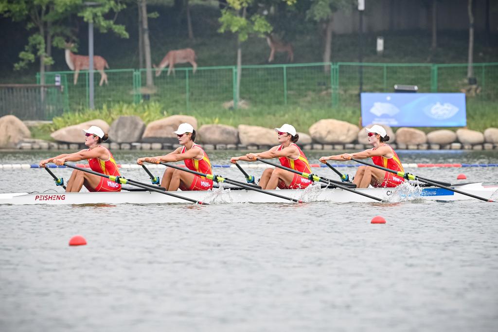 在女子四人雙槳決賽中,陳云霞、張靈、呂揚(yáng)、崔曉桐組成的奧運(yùn)冠軍組合,以6分42秒84的成績(jī)奪冠,伊朗隊(duì)和越南隊(duì)分獲二、三名。