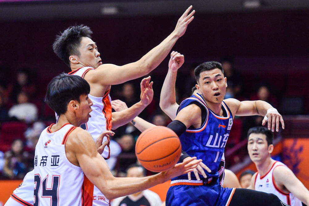 12月7日,山東隊(duì)球員高詩巖(前右)在比賽中傳球。新華社記者 朱崢 攝