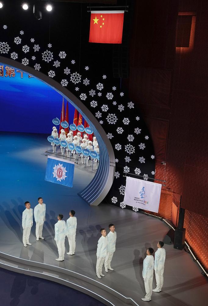 冰雪相約,同心筑夢。27日20時許,“十四冬”閉幕式在呼倫貝爾大劇院開始。在歡快熱烈的氣氛中,各參賽代表團(tuán)旗幟入場。全體起立,奏唱中華人民共和國國歌。
