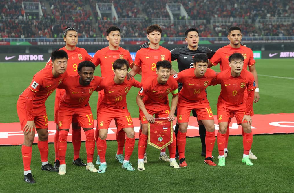 3月26日,中國(guó)隊(duì)首發(fā)球員在比賽前合影。新華社記者 賈浩成 攝