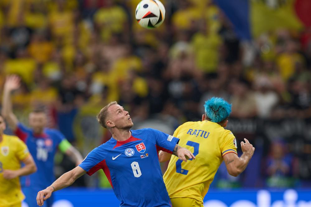 6月26日,斯洛伐克隊球員奧德·杜達(左)與羅馬尼亞隊球員安德烈·拉蒂烏在比賽中拼搶。新華社記者 孟鼎博 攝