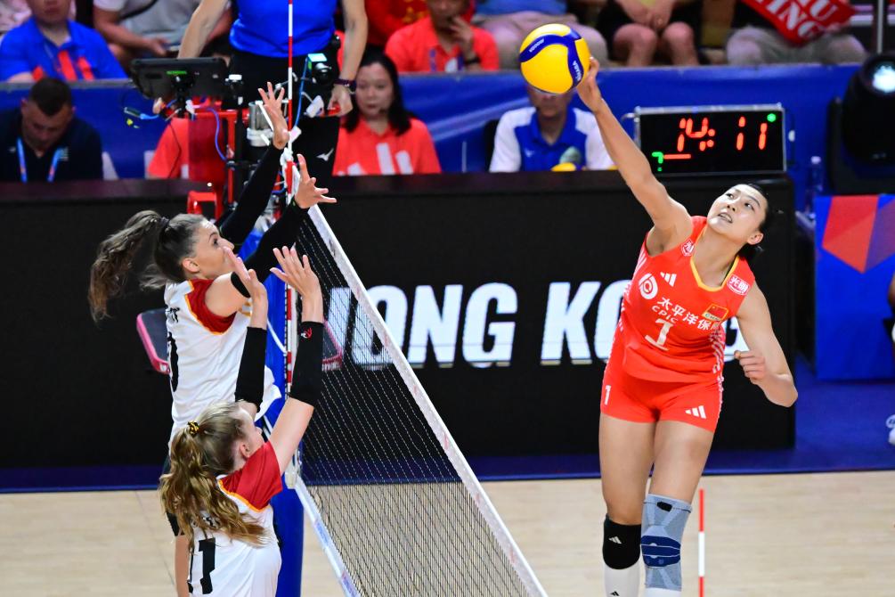 6月14日,中國隊球員袁心玥(右)在比賽中扣球。當(dāng)日,在世界女排聯(lián)賽中國香港站比賽中,中國隊3比0戰(zhàn)勝德國隊。新華社記者 朱煒 攝