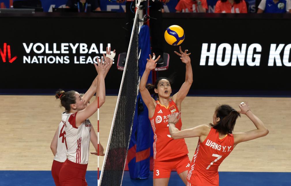 6月16日,中國隊球員刁琳宇(右二)在比賽中傳球。當(dāng)日,在世界女排聯(lián)賽中國香港站比賽中,中國隊3比0戰(zhàn)勝波蘭隊。新華社記者 盧炳輝 攝