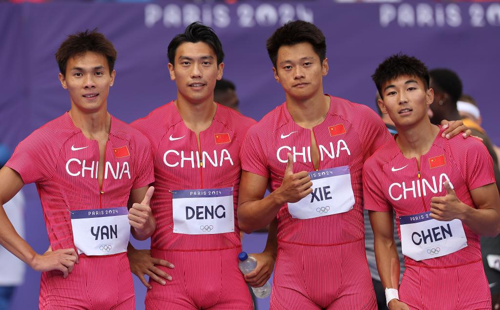 8月8日,中國隊選手陳佳鵬、謝震業(yè)、鄧智艦、嚴(yán)海濱(從右至左)在比賽后。新華社記者 李明 攝