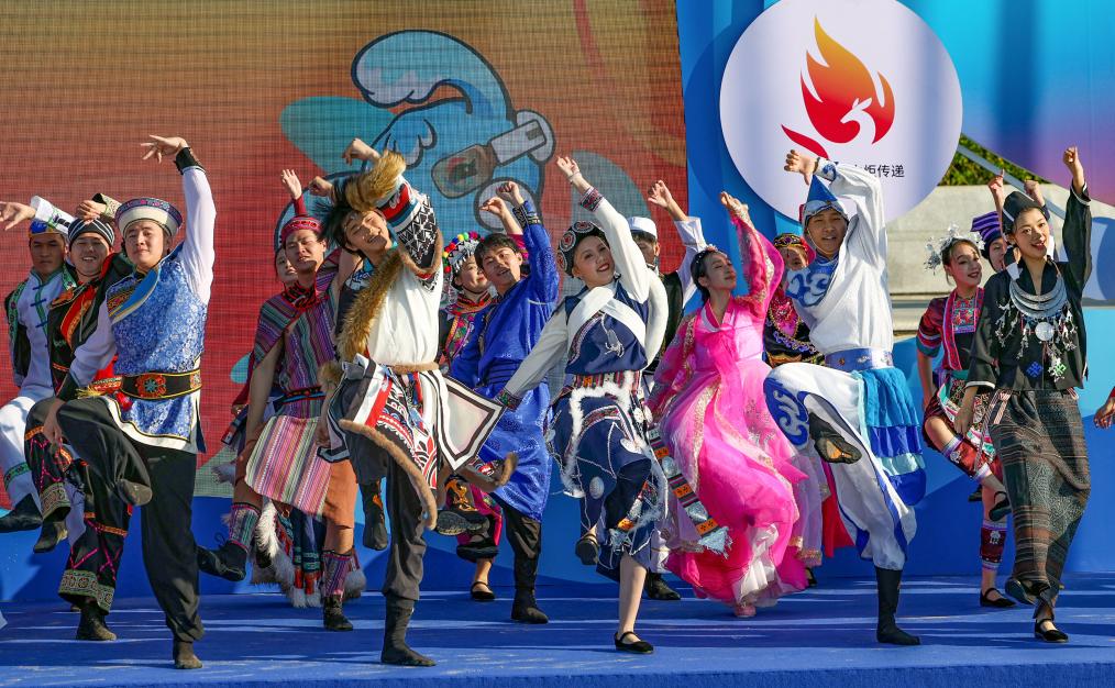 11月17日,演員在第十二屆全國少數(shù)民族傳統(tǒng)體育運(yùn)動會火炬實(shí)地傳遞活動起跑儀式上表演。新華社記者 陳朔 攝