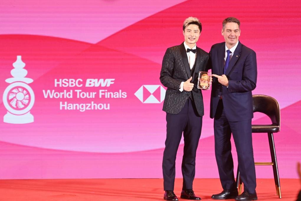 12月9日,世界羽聯(lián)主席拉爾森為獲得年度最佳男子單打運(yùn)動(dòng)員的中國選手石宇奇(左)頒獎(jiǎng)。新華社記者 黃宗治 攝