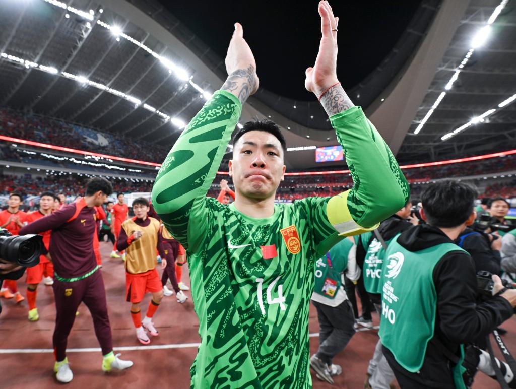 11月19日,在與日本隊的比賽后,中國隊守門員王大雷向球迷致意。新華社記者 姜克紅 攝