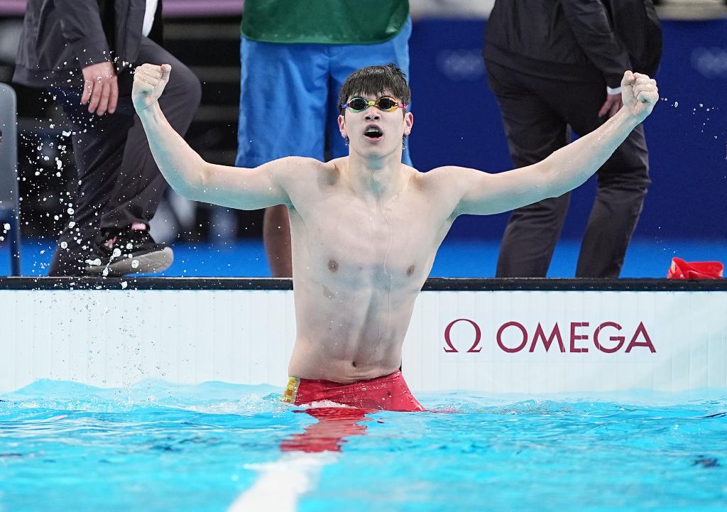 這是2024年7月31日,中國選手潘展樂在巴黎奧運會游泳項目男子100米自由泳決賽后慶祝。新華社記者 杜宇 攝