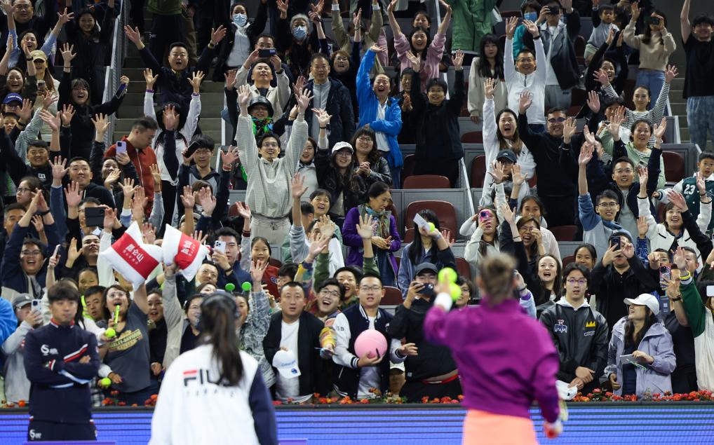 這是2024年9月30日,鄭欽文在2024中國網(wǎng)球公開賽女單第三輪比賽后和觀眾互動。新華社記者 白雪飛 攝
