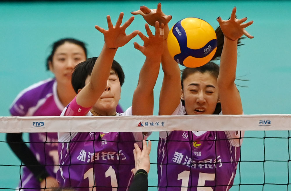 2月25日,天津隊球員陳博雅、王媛媛(右)在比賽中攔網。新華社記者 趙子碩 攝