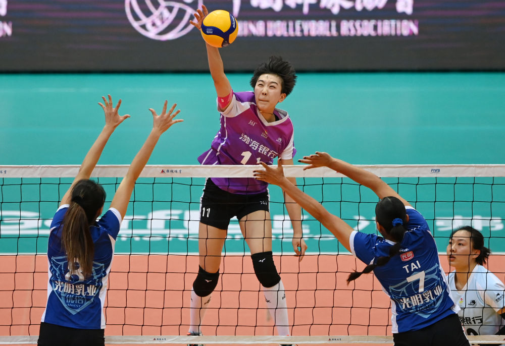 2月25日,天津隊球員陳博雅(中)在比賽中扣球。新華社記者 趙子碩 攝