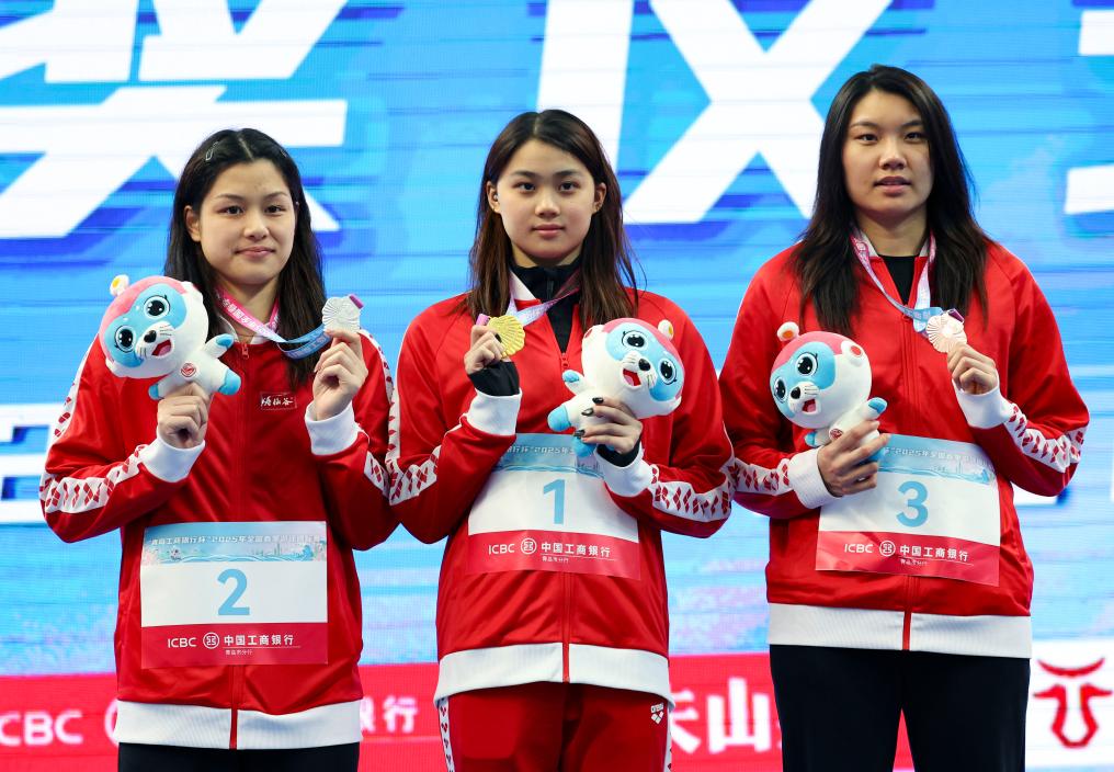 3月18日,冠軍浙江隊選手鄭惠予(中)、亞軍浙江隊選手余依婷(左)和季軍浙江隊選手柳雅欣在女子200米個人混合泳頒獎儀式上。新華社記者 雒圓 攝