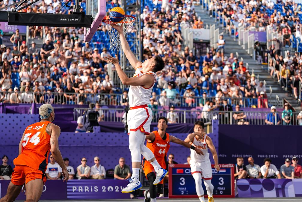 2024年7月30日,中國隊球員張寧(上)在巴黎奧運會三人籃球男子分組循環(huán)賽中上籃。新華社記者 朱崢 攝
