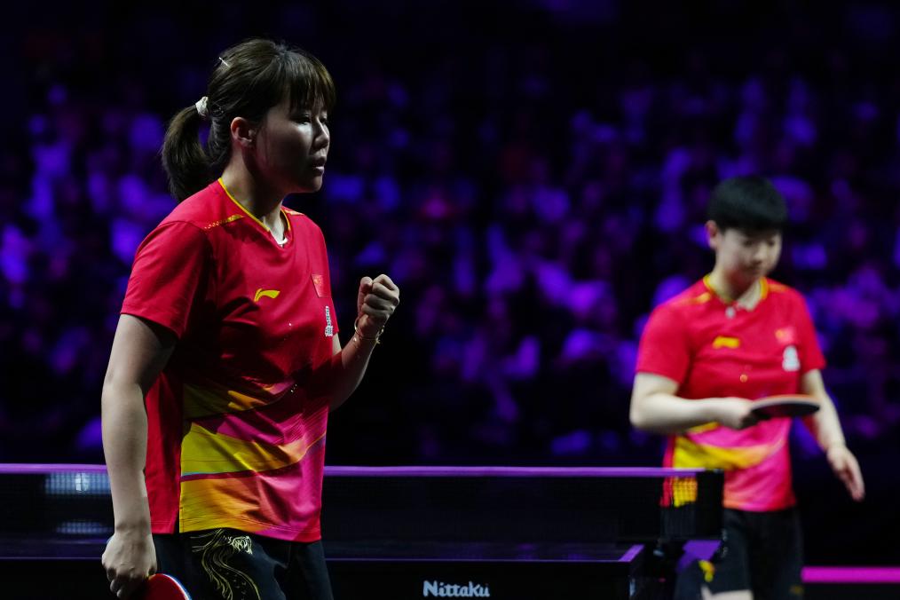陳幸同(左)在與孫穎莎的比賽中慶祝得分。新華社記者 賈浩成 攝