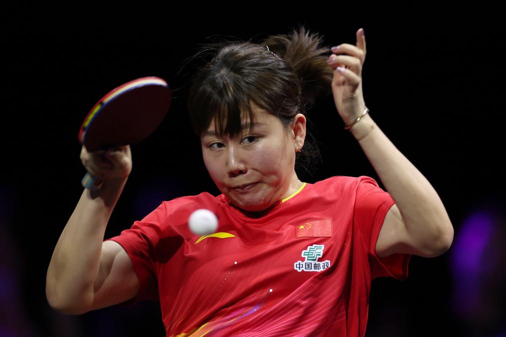 陳幸同在與孫穎莎的決賽中回球。新華社記者 賈浩成 攝