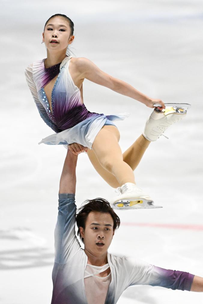 8月13日,張嘉軒/黃一航(下)在雙人滑自由滑比賽中,他們獲得雙人滑第一名。新華社記者 鞠煥宗 攝