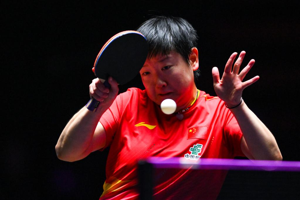 9月14日,孫穎莎在比賽中回球。新華社發(fā)(張金加 攝)