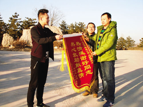 葛大爺?shù)募胰讼蝰R國(guó)榮(右一)贈(zèng)送錦旗(張林全 攝)