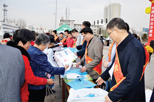忻州市水資辦的工作人員在街頭進(jìn)行涉水法律法規(guī)和節(jié)水知識宣傳