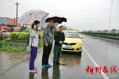 4月6日智杰(中)、南京出租車司機(jī)夏?。ㄓ遥┖捅緢?bào)記者在當(dāng)時(shí)709路公交車急剎車停靠地(智存虎 攝)